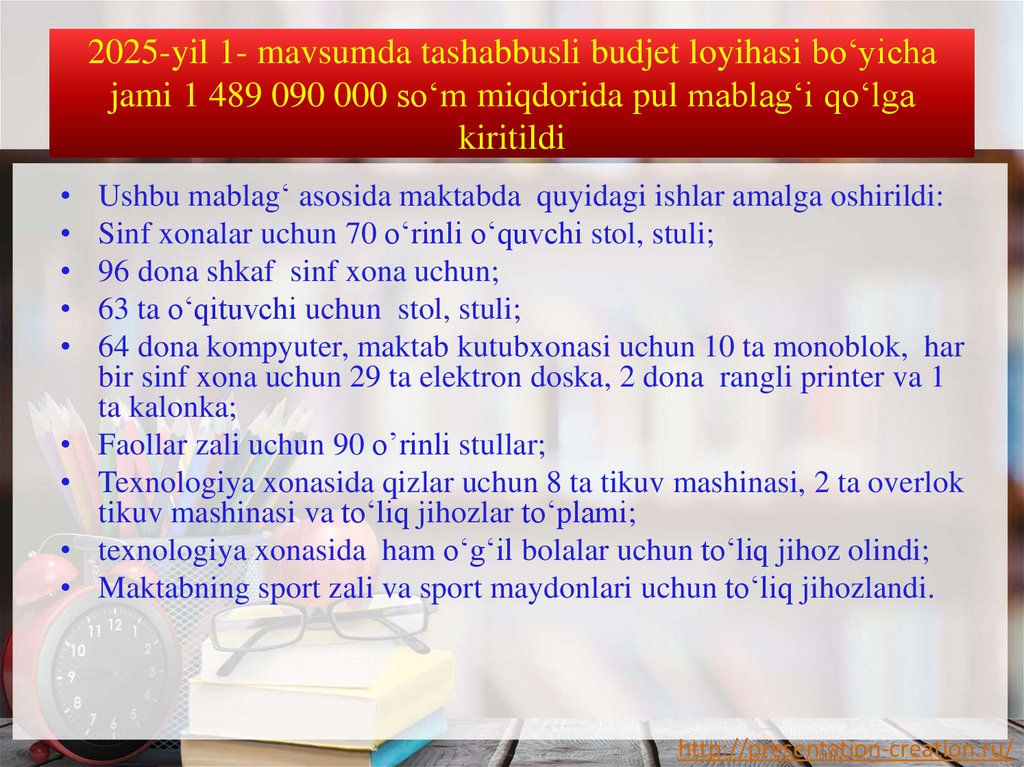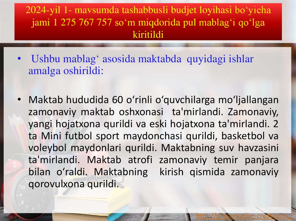 Ushbu mablag‘ asosida maktabda quyidagi ishlar amalga oshirildi: