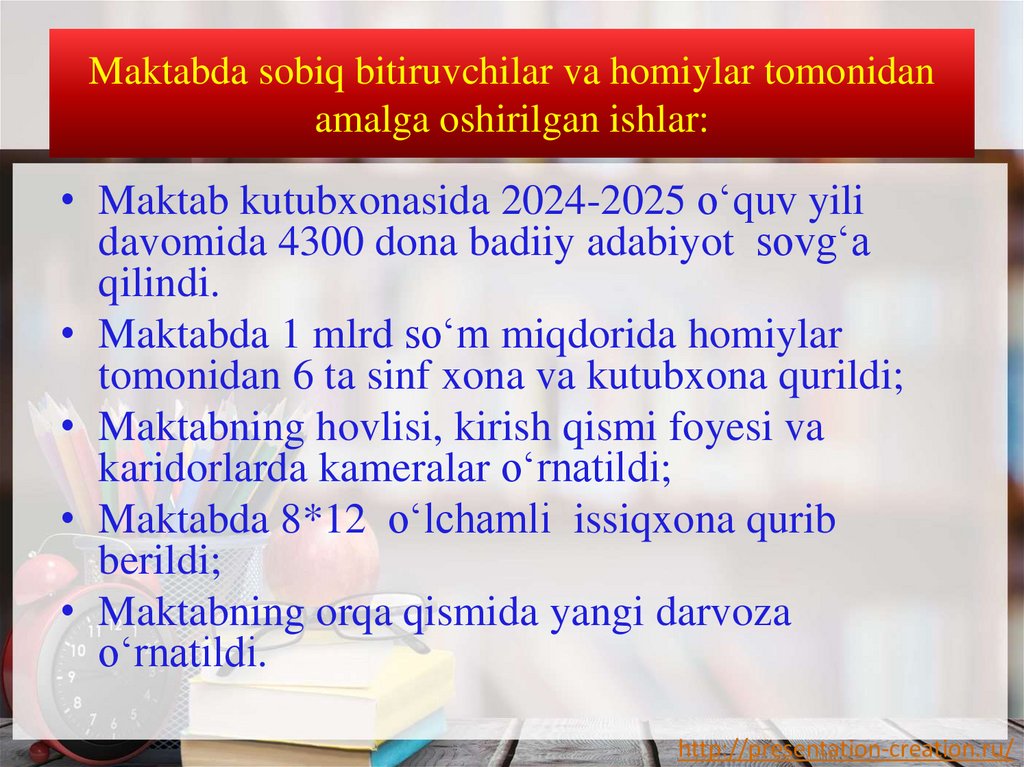 8. Maktabda sobiq bitiruvchilar va homiylar tomonidan amalga oshirilgan ishlar: