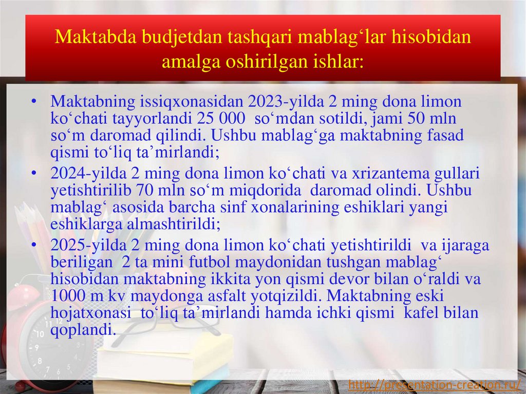 • Ushbu mablag‘ asosida maktabda quyidagi ishlaramalga oshirildi: