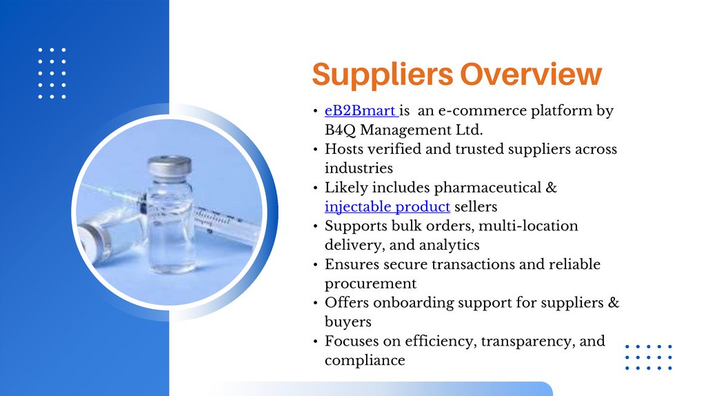 Suppliers Overview• eB2Bmart is an e-commerce platform by