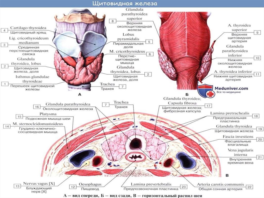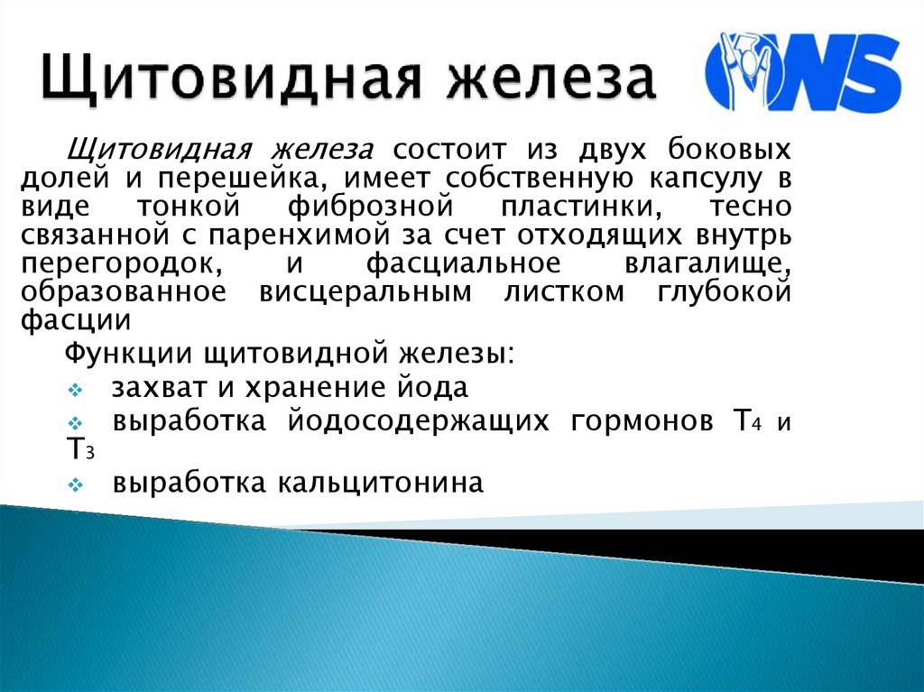 Щитовидная железа состоит из двух боковыхдолей и перешейка, имеет собственную капсулу в