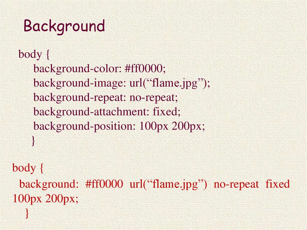 background: #ff0000 url(“flame.jpg”) no-repeat fixed