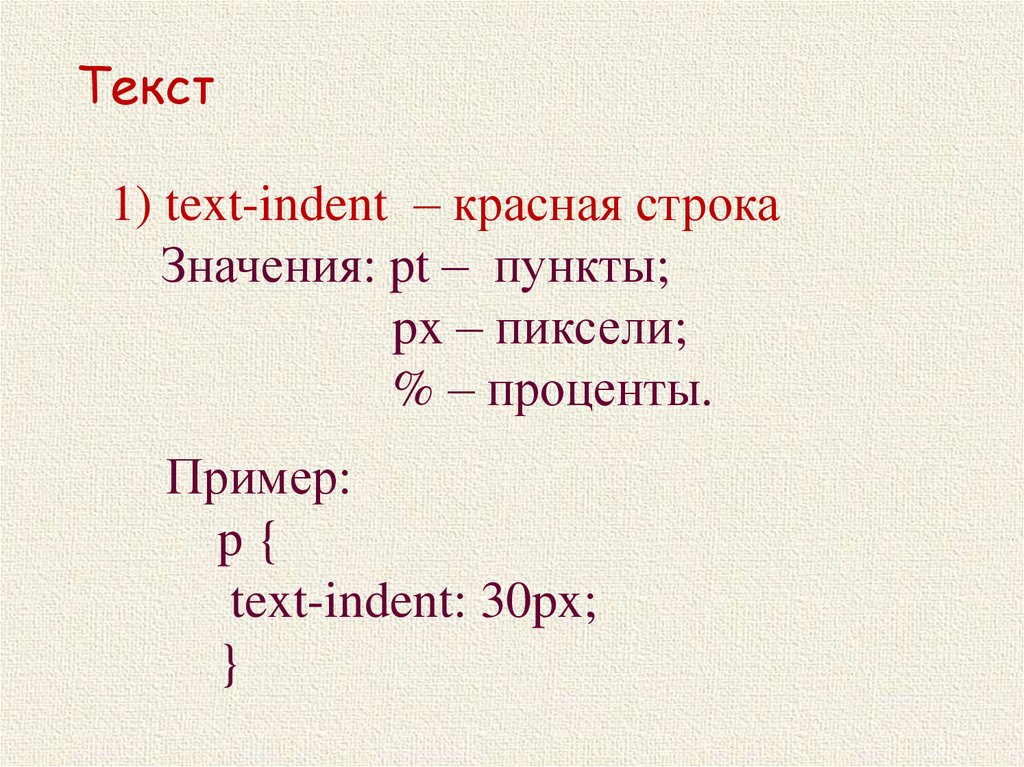 Значения: pt – пункты;