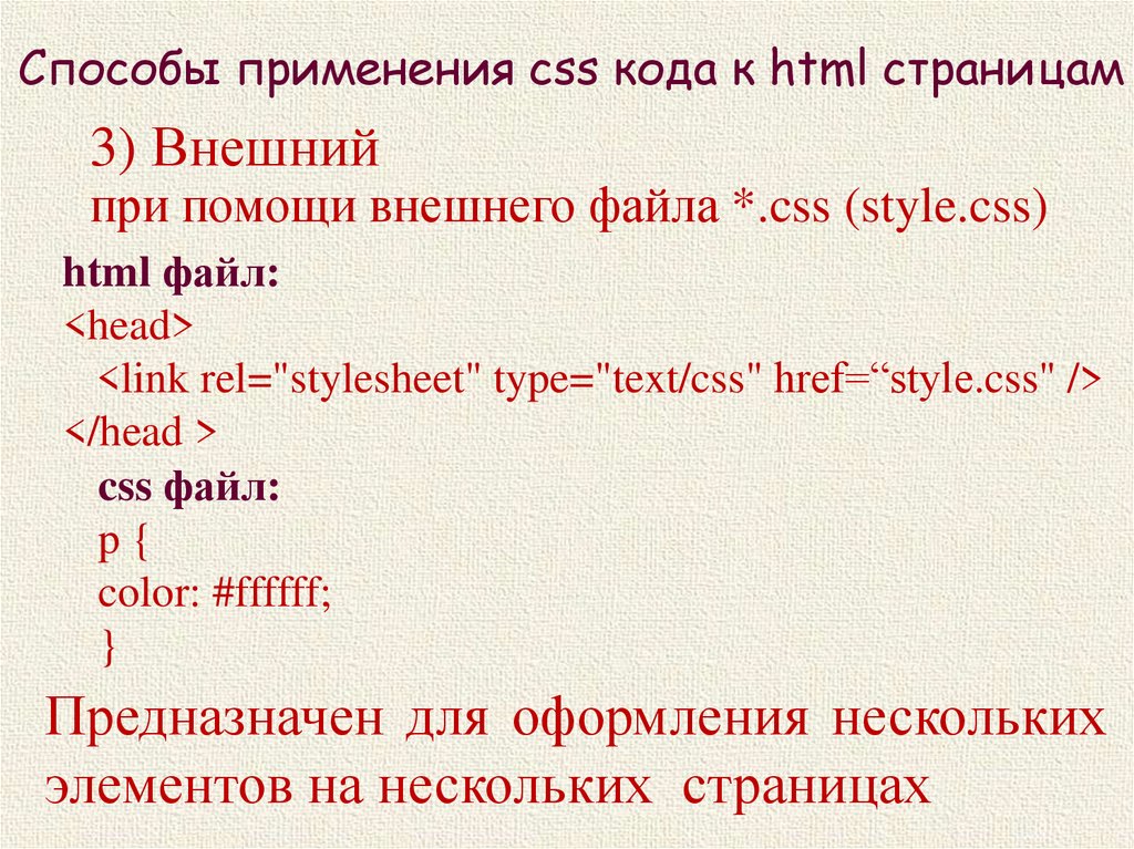 Способы применения css кода к html страницам3) Внешний