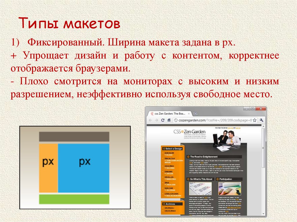 Типы макетов1) Фиксированный. Ширина макета задана в px.
