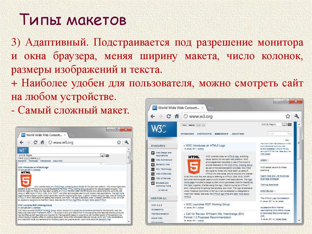 Типы макетов3) Адаптивный. Подстраивается под разрешение монитора