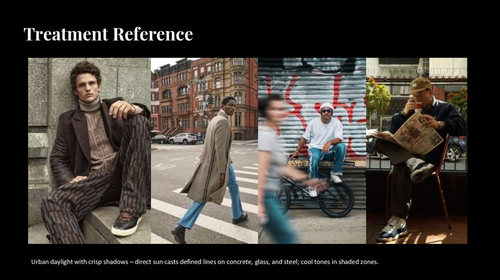Treatment ReferenceUrban daylight with crisp shadows – direct sun casts defined lines on concrete, glass, and steel; cool tones in shaded zones.