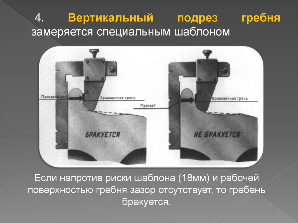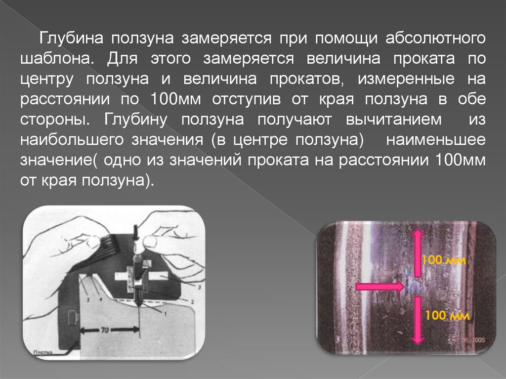 Глубина ползуна замеряется при помощи абсолютногошаблона. Для этого замеряется величина проката по