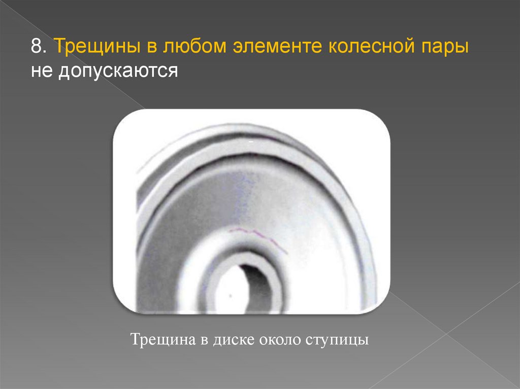 8. Трещины в любом элементе колесной парыне допускаются