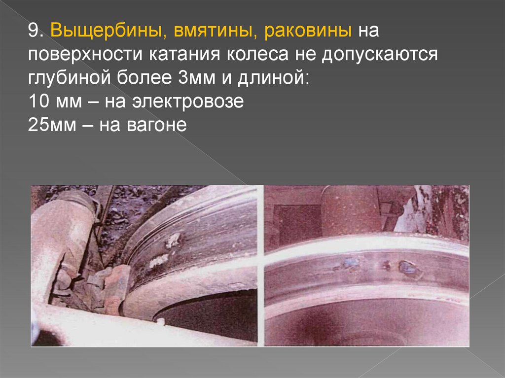 9. Выщербины, вмятины, раковины наповерхности катания колеса не допускаются
