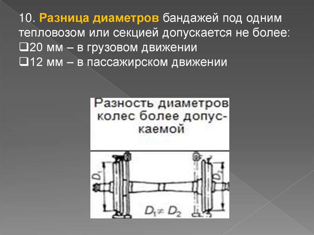 10. Разница диаметров бандажей под однимтепловозом или секцией допускается не более: