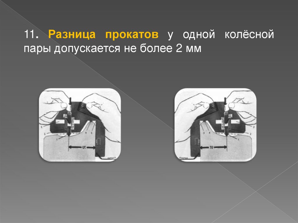 11. Разница прокатов у одной колёснойпары допускается не более 2 мм