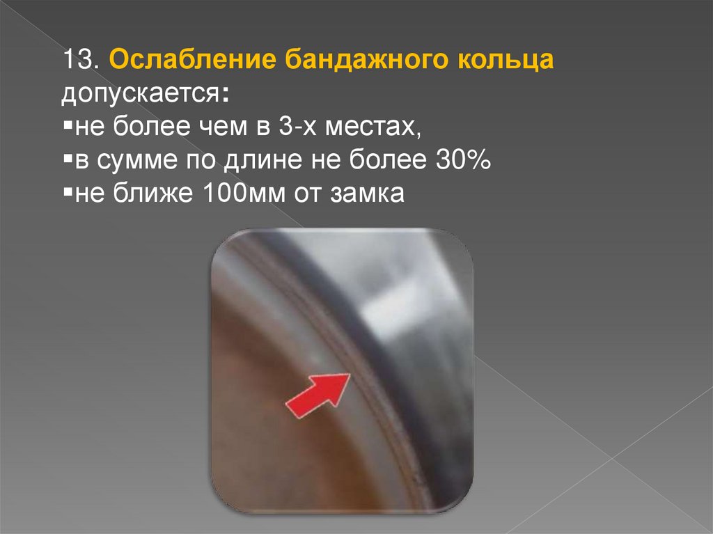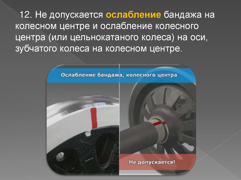 12. Не допускается ослабление бандажа наколесном центре и ослабление колесного