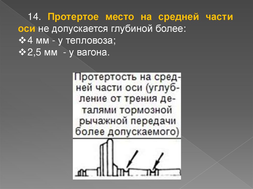14. Протертое место на средней частиоси не допускается глубиной более: