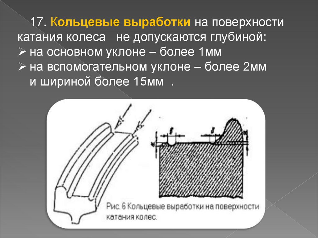 17. Кольцевые выработки на поверхностикатания колеса не допускаются глубиной: