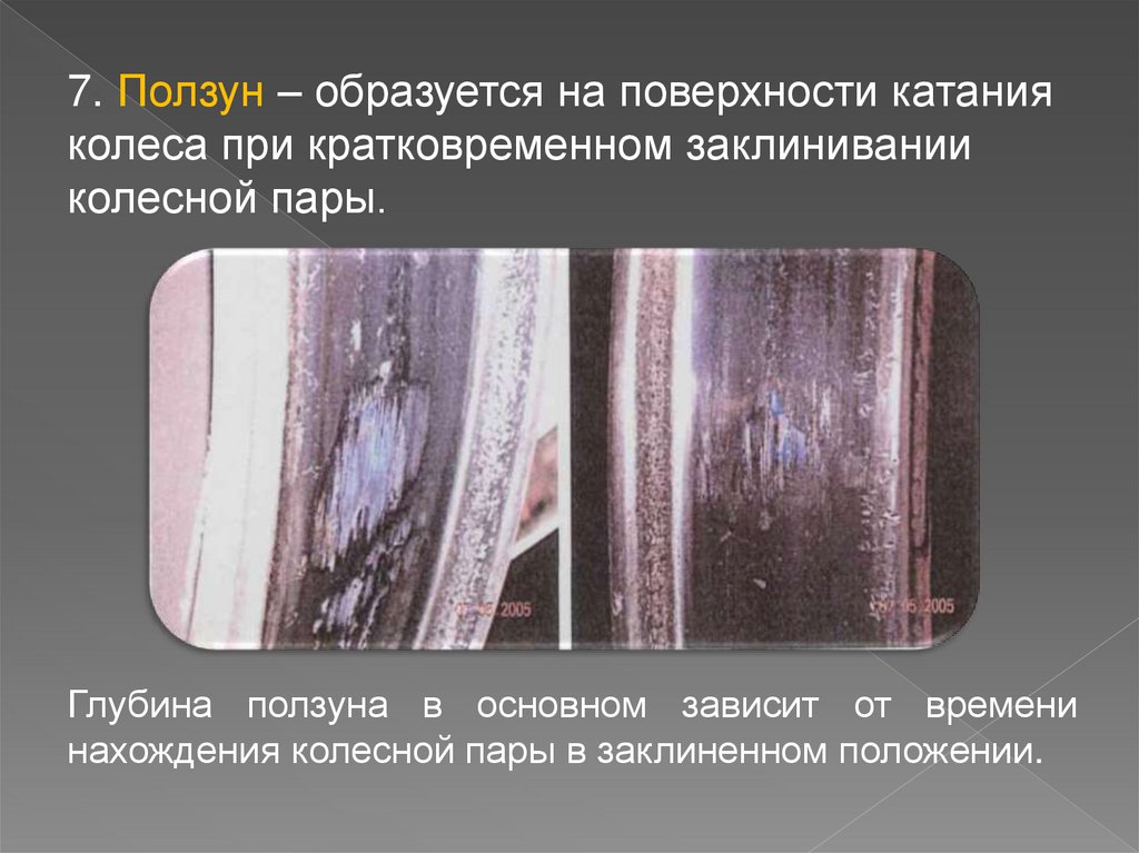 7. Ползун – образуется на поверхности катанияколеса при кратковременном заклинивании