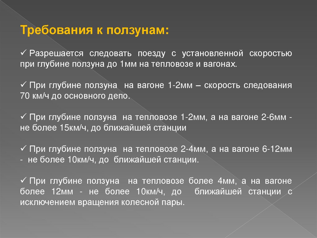 При глубине ползуна на тепловозе 1-2мм, а на вагоне 2-6мм не более 15км/ч, до ближайшей станции