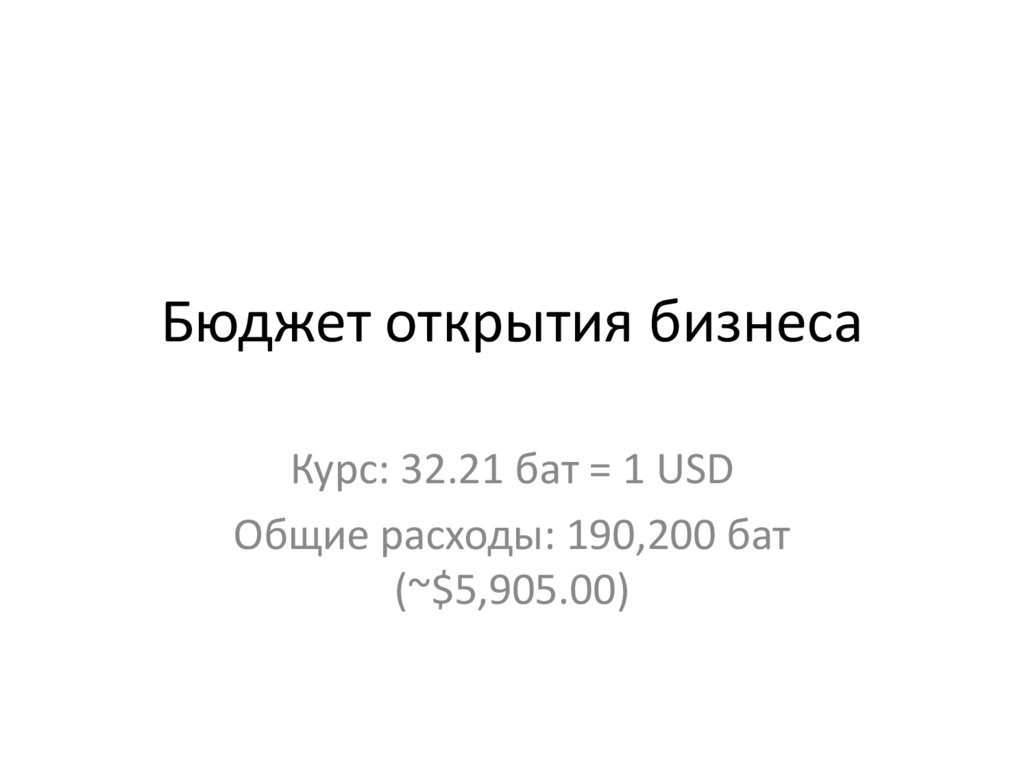 Бюджет открытия бизнесаКурс: 32.21 бат = 1 USD