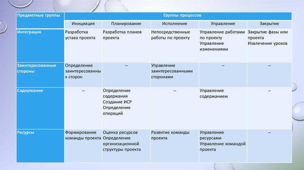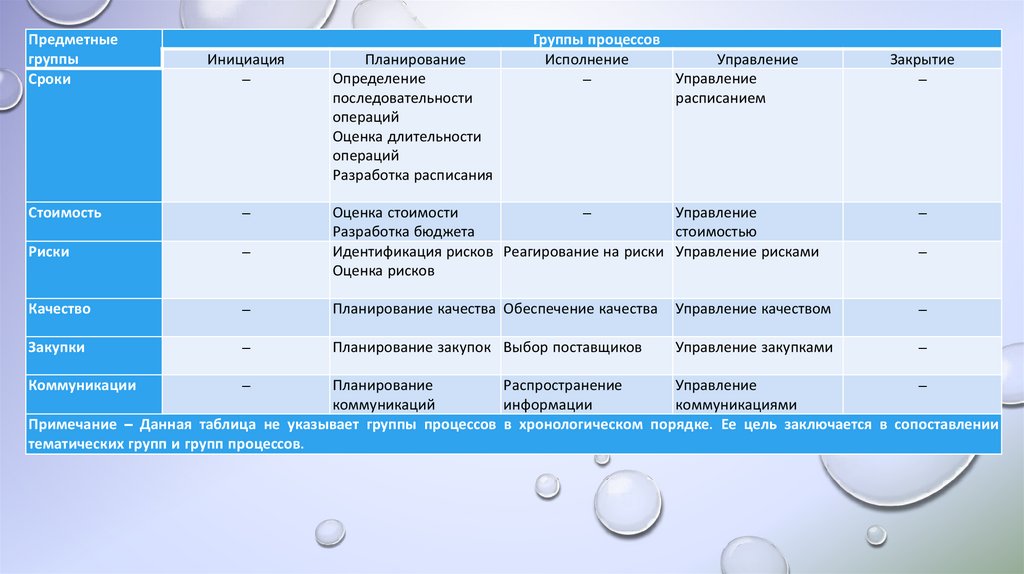 Примечание – Данная таблица не указывает группы процессов в хронологическом порядке. Ее цель заключается в сопоставлении