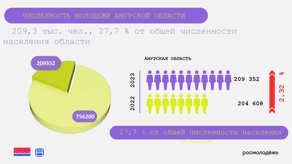ЧИСЛЕННОСТЬ МОЛОДЕЖИ АМУРСКОЙ ОБЛАСТИ209,3 тыс. чел., 27,7 % от общей численности