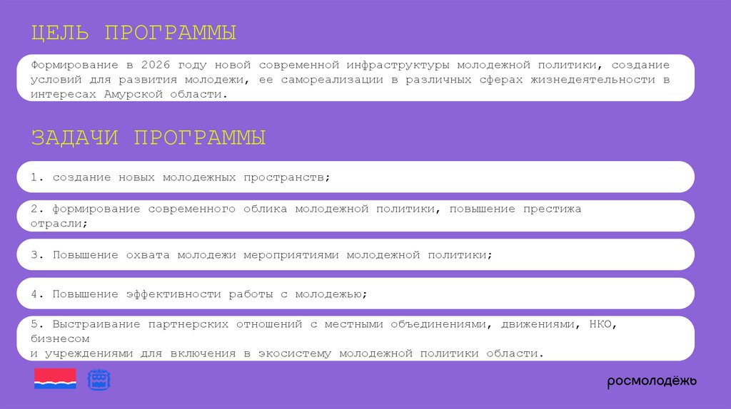 ЦЕЛЬ ПРОГРАММЫФормирование в 2026 году новой современной инфраструктуры молодежной политики, создание