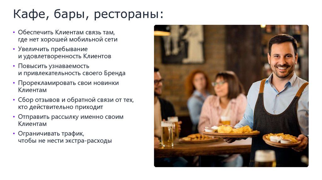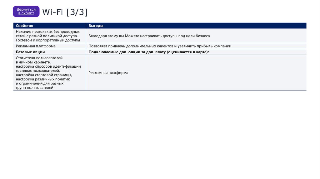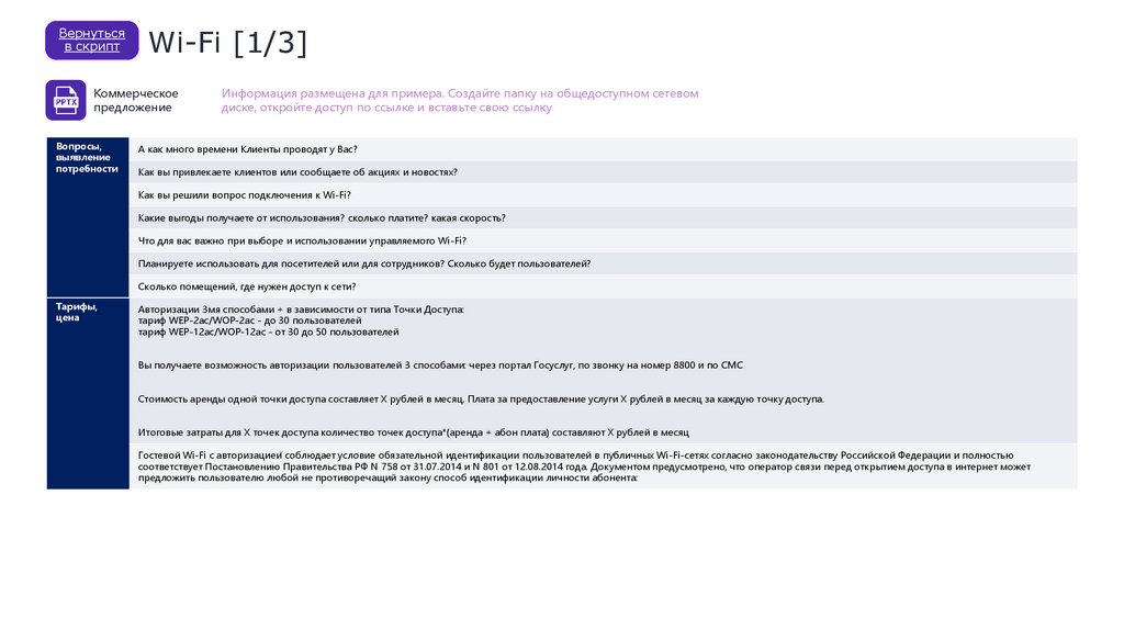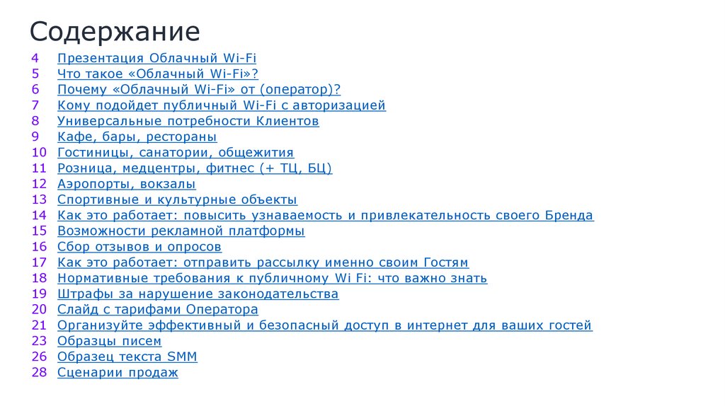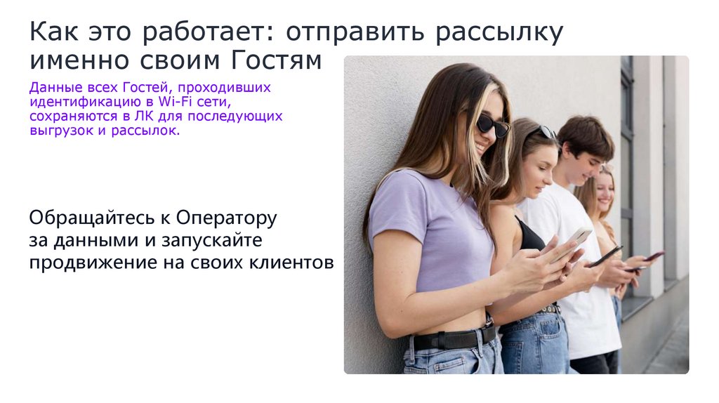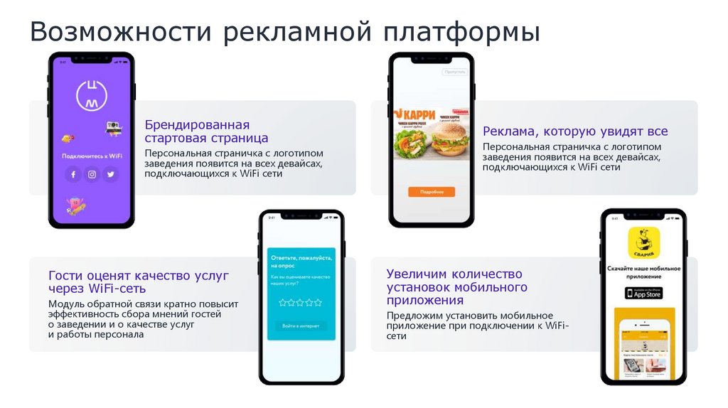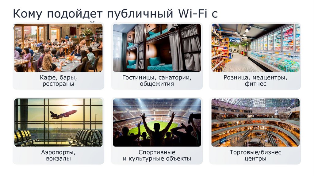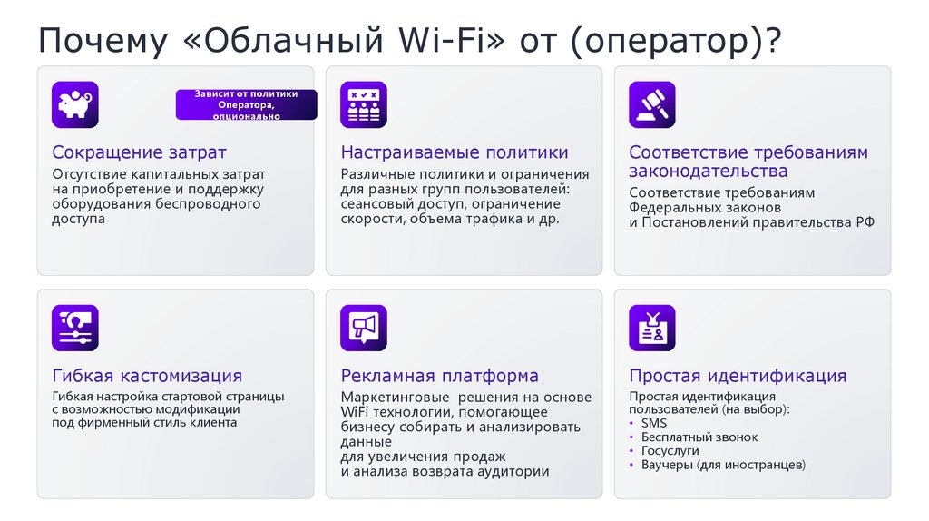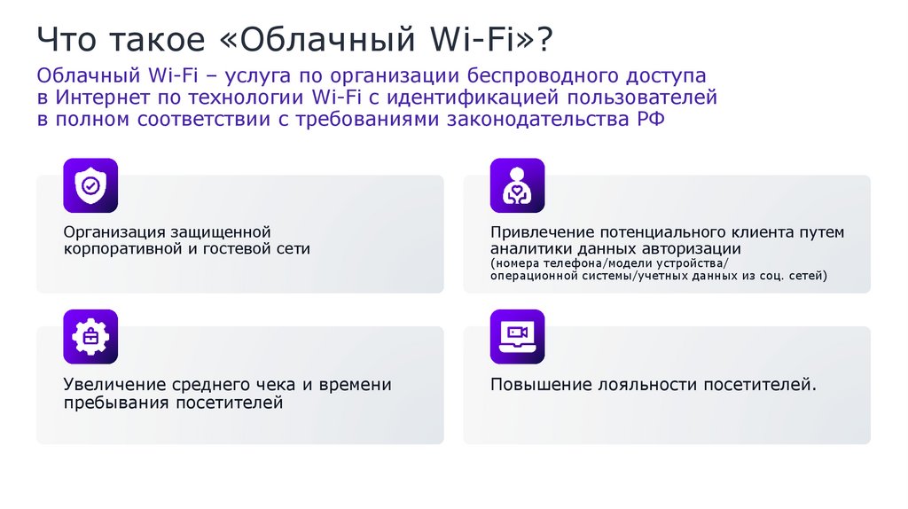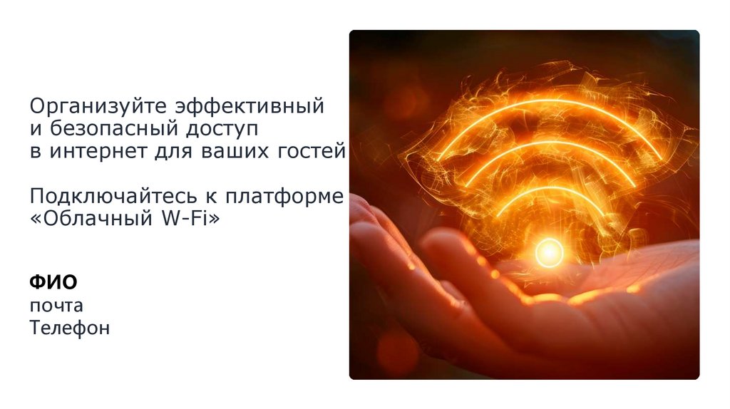 Мы предлагаем масштабируемую платформу «Облачный Wi-Fi» от [Оператор],«Wi-Fi» . Это не просто доступ в интернет, а полноценный цифровой канал