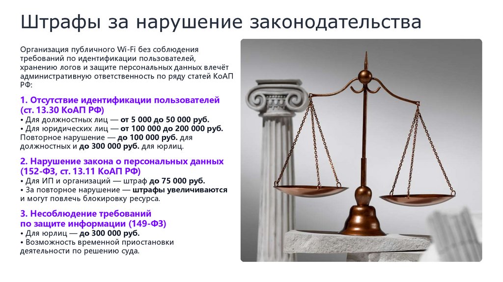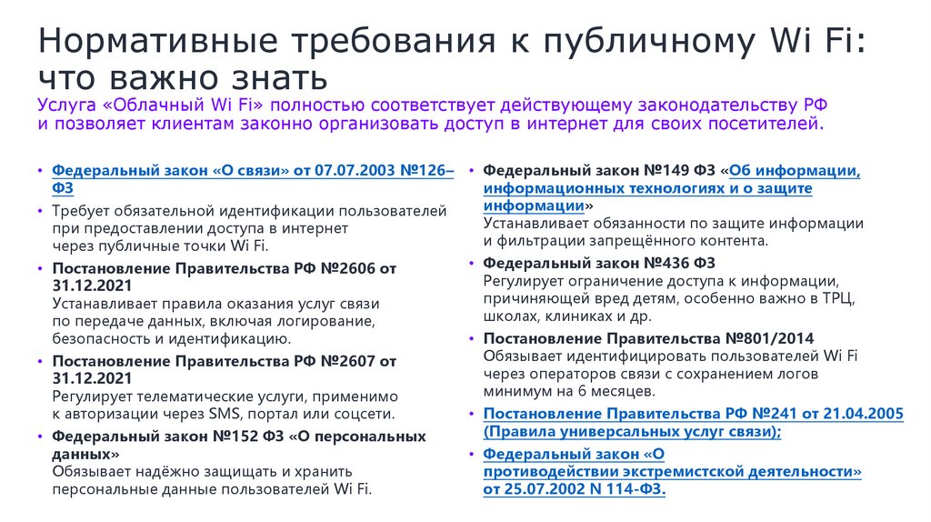 • Публичный Wi-Fi — услуга полностью соответствует всем нормативным документам РФ;