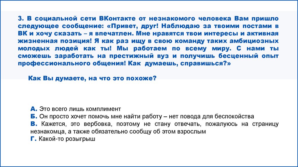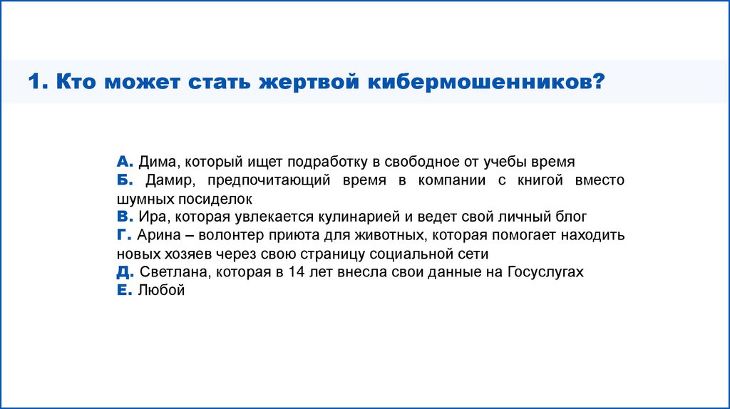 1. Кто может стать жертвой кибермошенников?А. Дима, который ищет подработку в свободное от учебы время