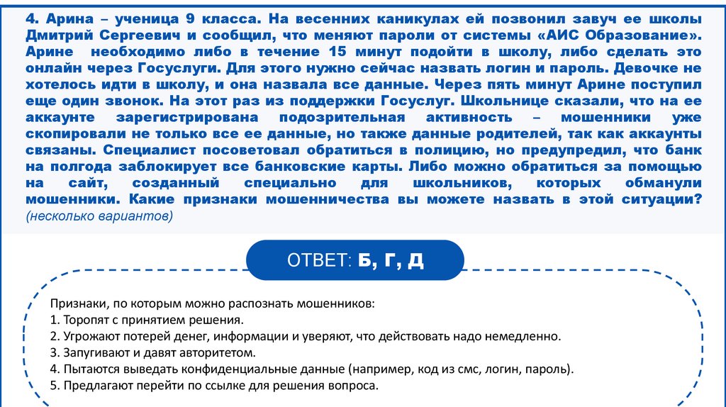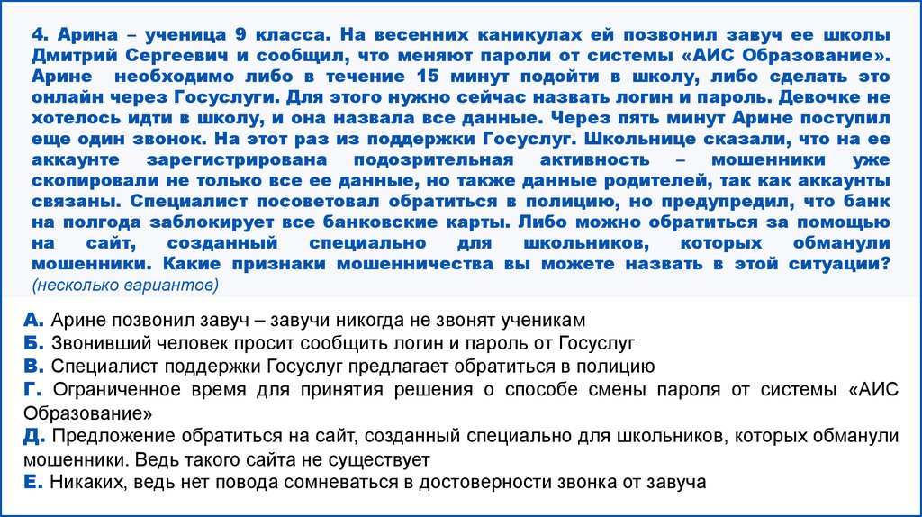 4. Арина – ученица 9 класса. На весенних каникулах ей позвонил завуч ее школыДмитрий Сергеевич и сообщил, что меняют пароли от системы «АИС Образование».