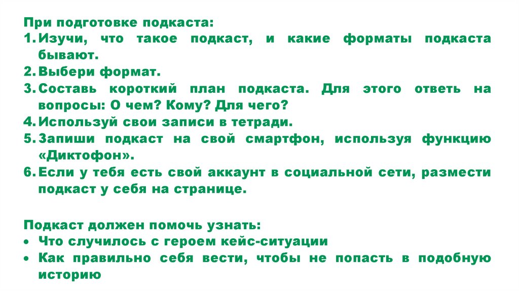 При подготовке подкаста:1. Изучи, что такое подкаст, и какие форматы подкаста