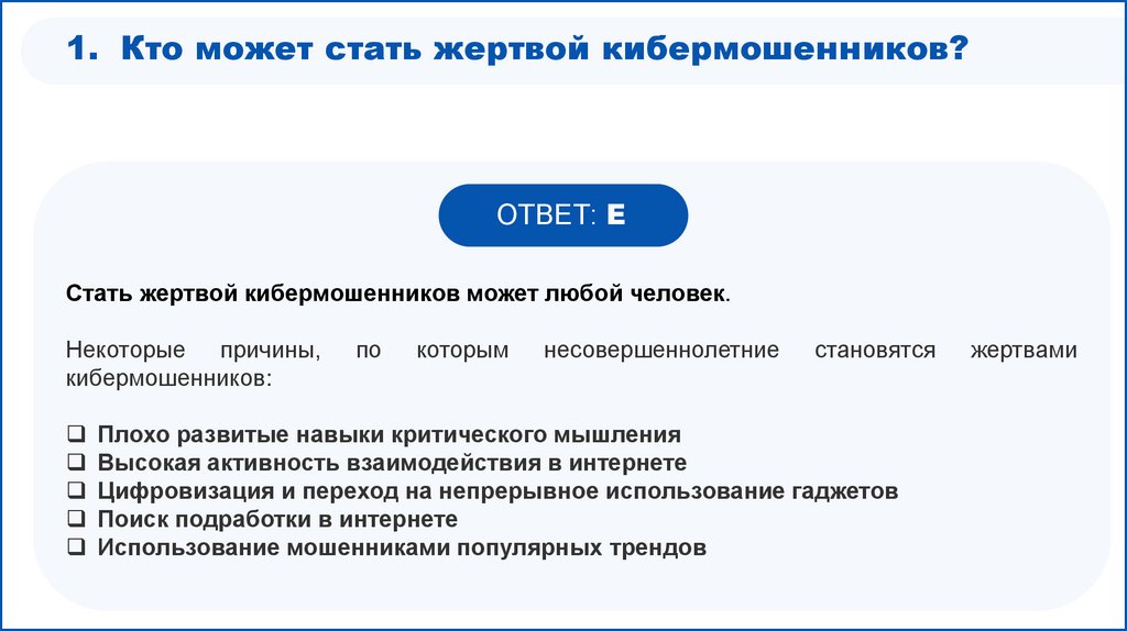 1. Кто может стать жертвой кибермошенников?ОТВЕТ: Е