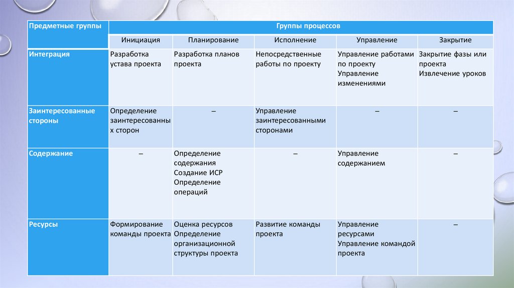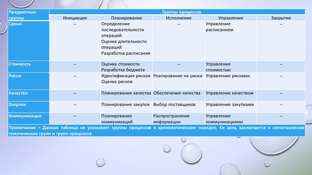 Примечание – Данная таблица не указывает группы процессов в хронологическом порядке. Ее цель заключается в сопоставлении