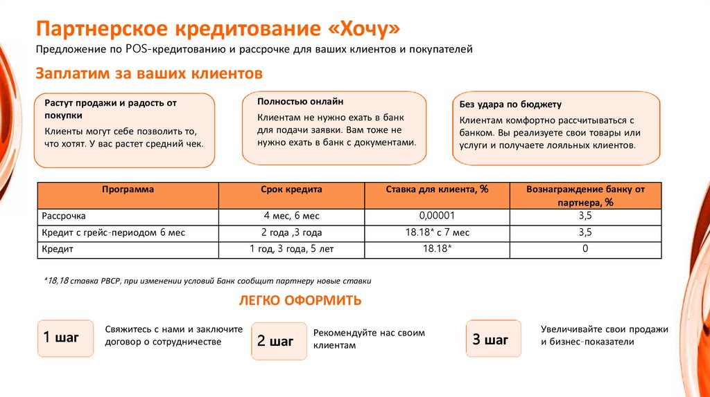Партнерское кредитование «Хочу»Предложение по POS-кредитованию и рассрочке для ваших клиентов и покупателей