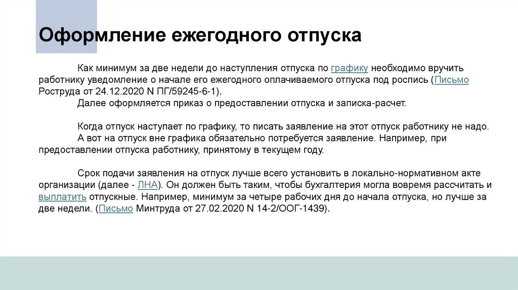 РФ). Дату начала отпуска мы можем увидеть либо в графике отпусков, либо в заявлении работника.