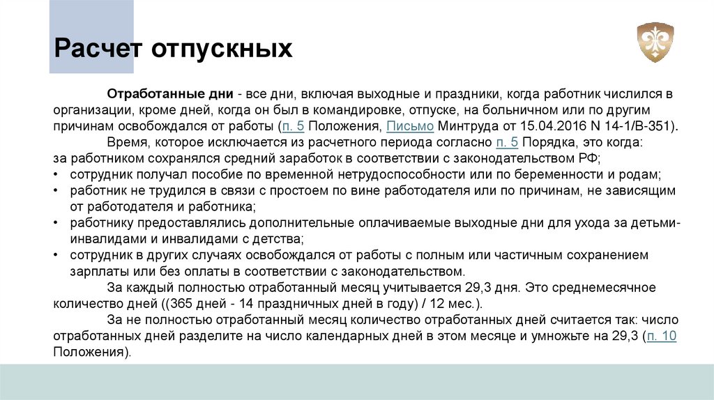 Расчет отпускныхОтработанные дни - все дни, включая выходные и праздники, когда работник числился в