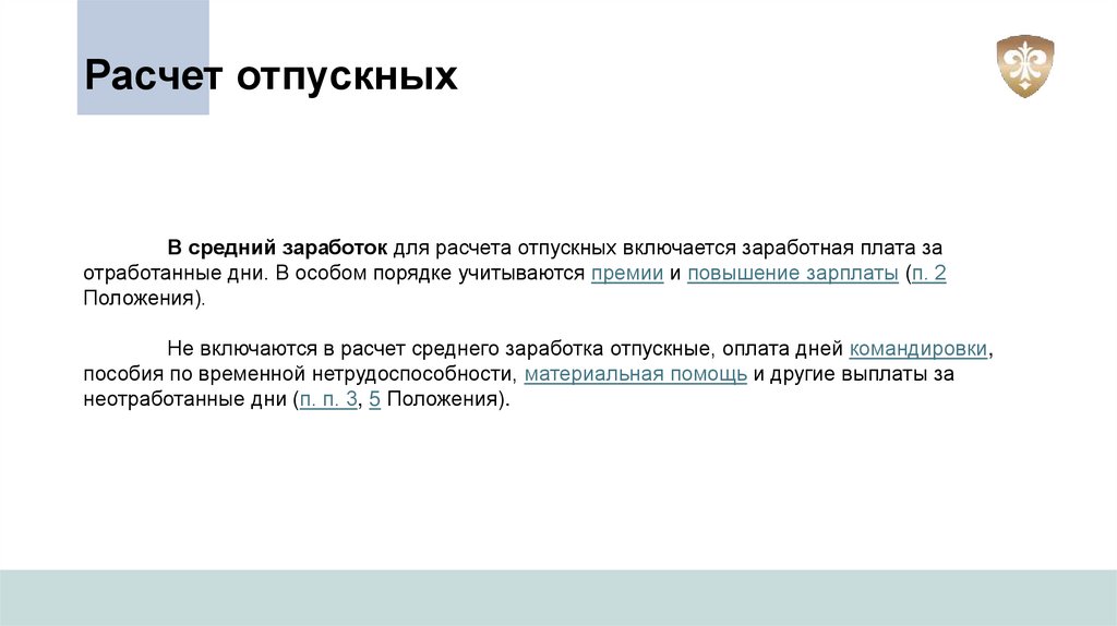 Расчет отпускныхВ средний заработок для расчета отпускных включается заработная плата за