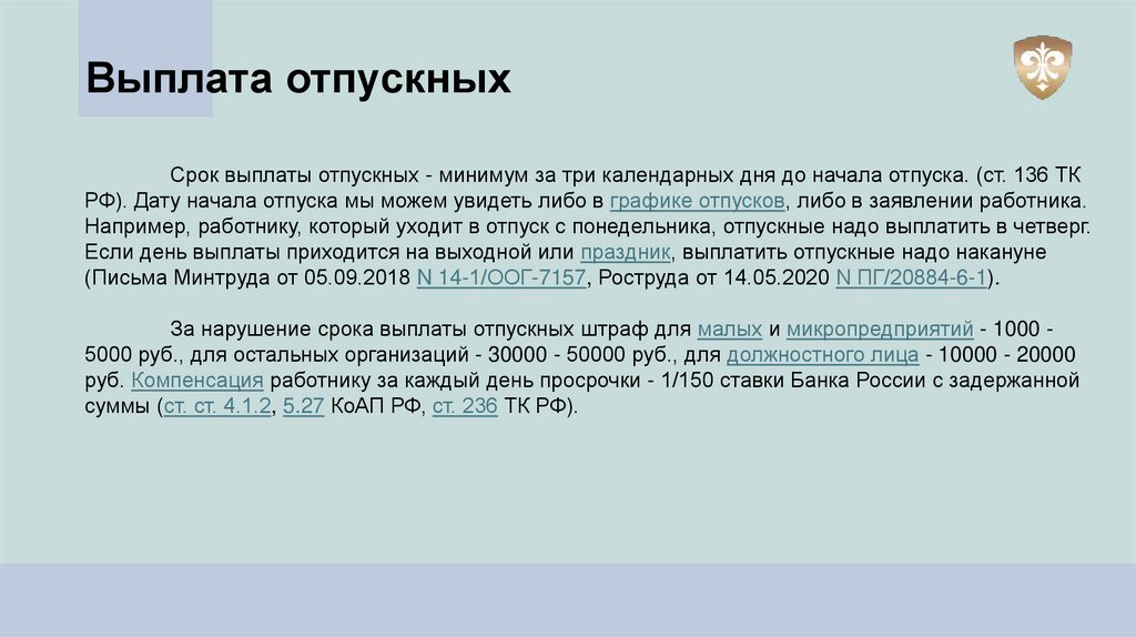 Если день выплаты приходится на выходной или праздник, выплатить отпускные надо накануне