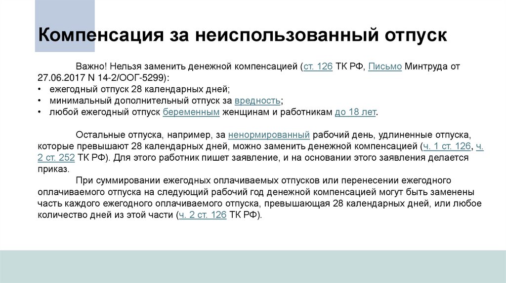 которые превышают 28 календарных дней, можно заменить денежной компенсацией (ч. 1 ст. 126, ч.