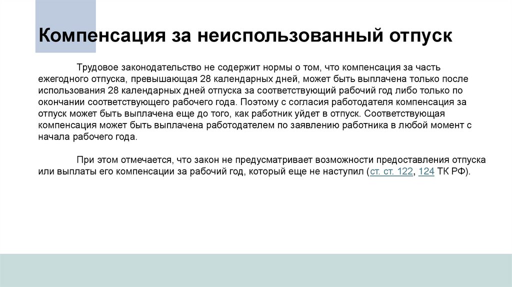 или выплаты его компенсации за рабочий год, который еще не наступил (ст. ст. 122, 124 ТК РФ).