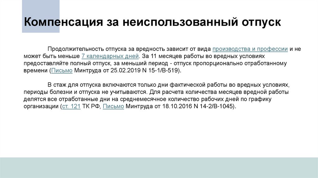 Компенсация за неиспользованный отпускПродолжительность отпуска за вредность зависит от вида производства и профессии и не