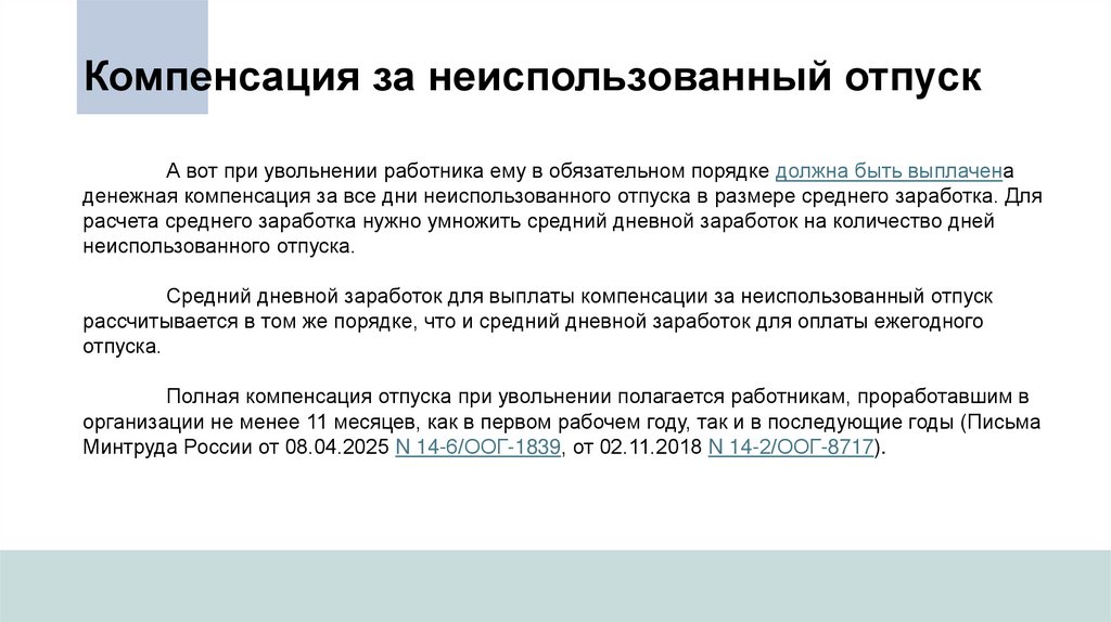 Компенсация за неиспользованный отпускА вот при увольнении работника ему в обязательном порядке должна быть выплачена