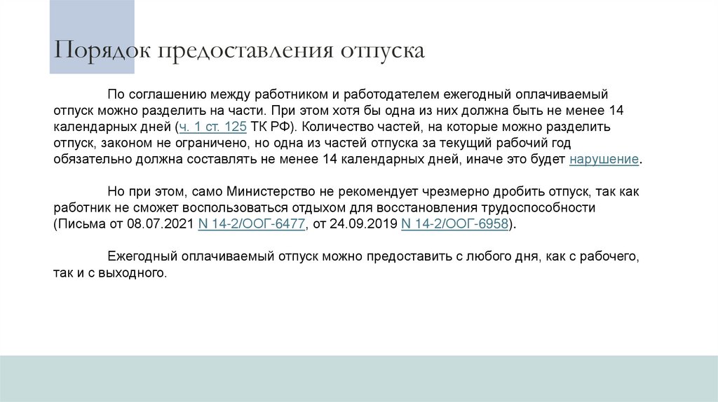 календарных дней (ч. 1 ст. 125 ТК РФ). Количество частей, на которые можно разделить