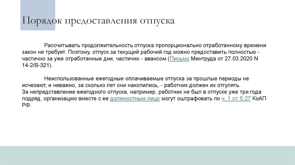 Порядок предоставления отпускаРассчитывать продолжительность отпуска пропорционально отработанному времени