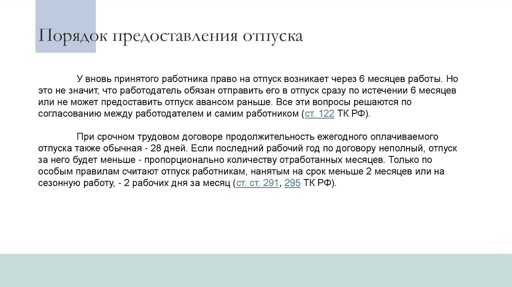 особым правилам считают отпуск работникам, нанятым на срок меньше 2 месяцев или на