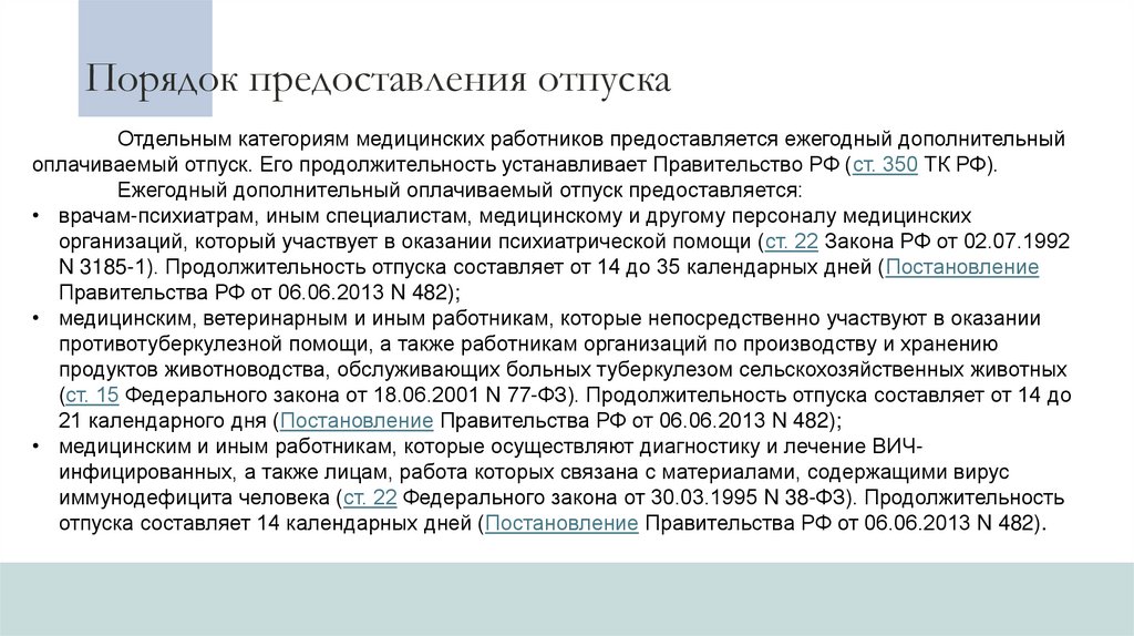 Порядок предоставления отпускаДополнительный отпуск отдельным категориям медработников в количестве