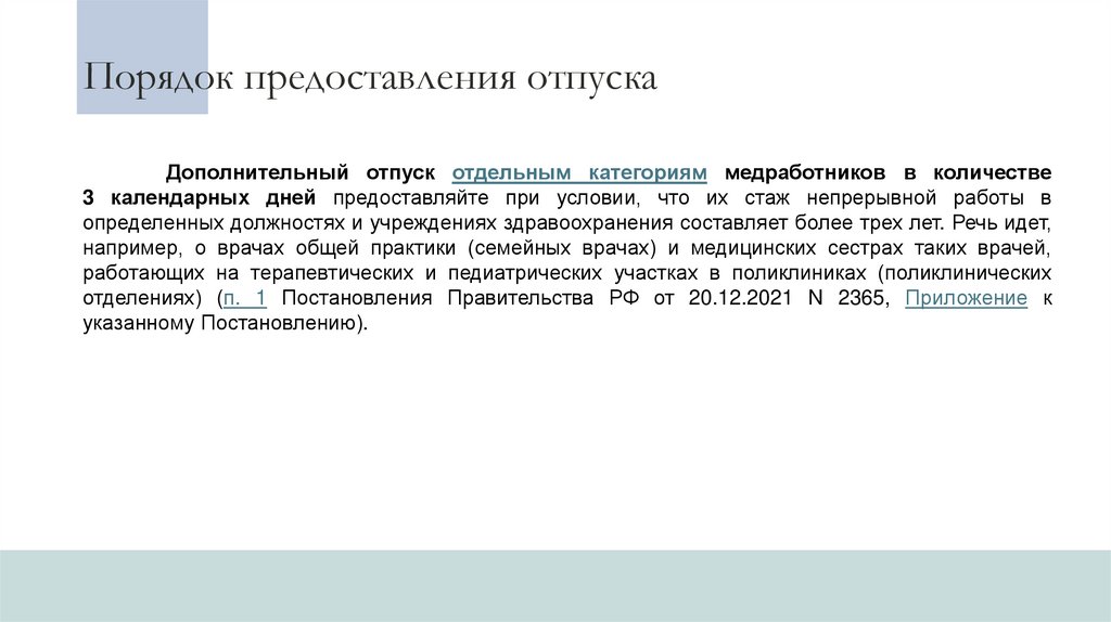 Порядок предоставления отпускаОтдельным категориям медицинских работников предоставляется ежегодный дополнительный