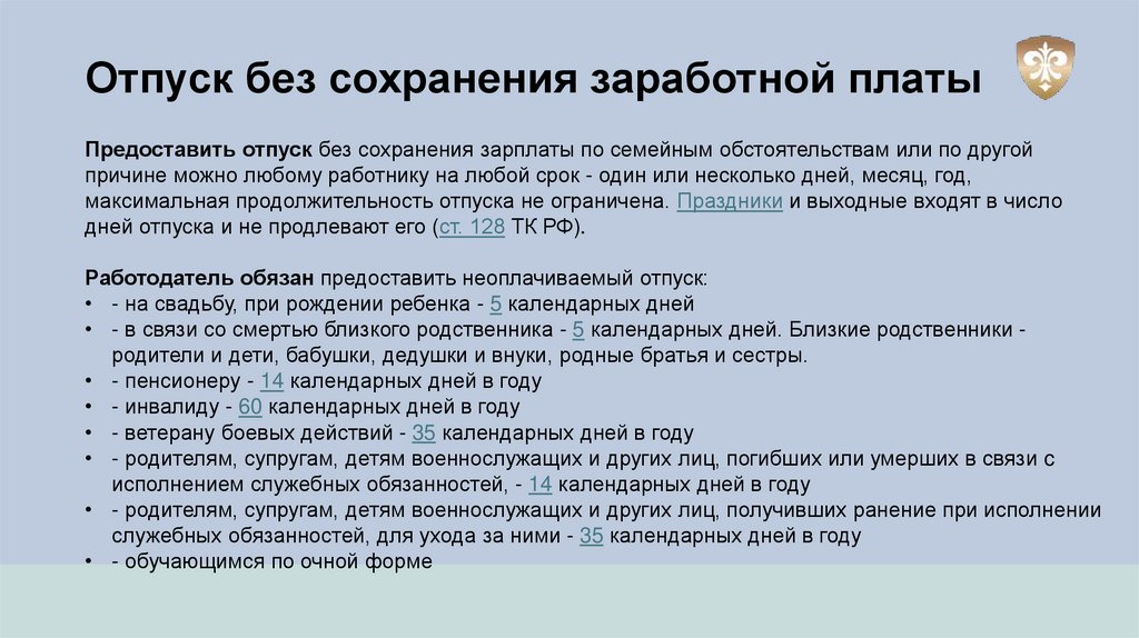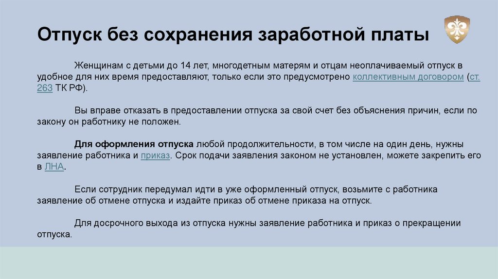 Отпуск без сохранения заработной платыЖенщинам с детьми до 14 лет, многодетным матерям и отцам неоплачиваемый отпуск в