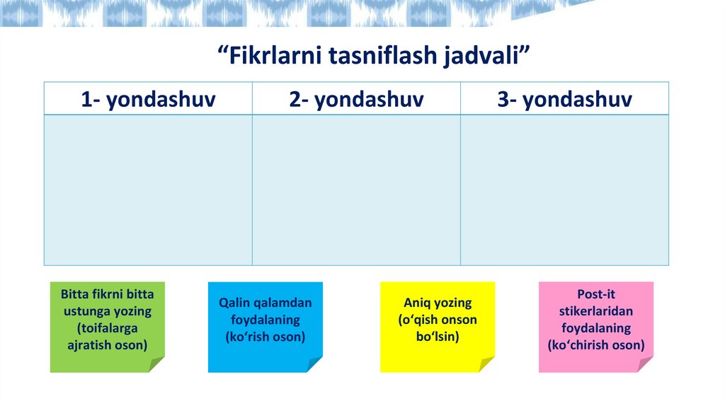 “Fikrlarni tasniflash jadvali”1- yondashuv