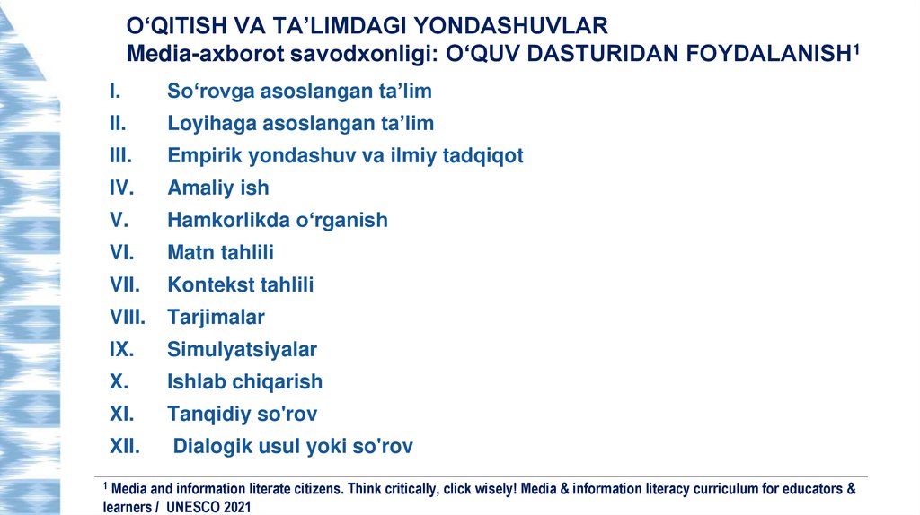 O‘QITISH VA TA’LIMDAGI YONDASHUVLARMedia-axborot savodxonligi: O‘QUV DASTURIDAN FOYDALANISH1