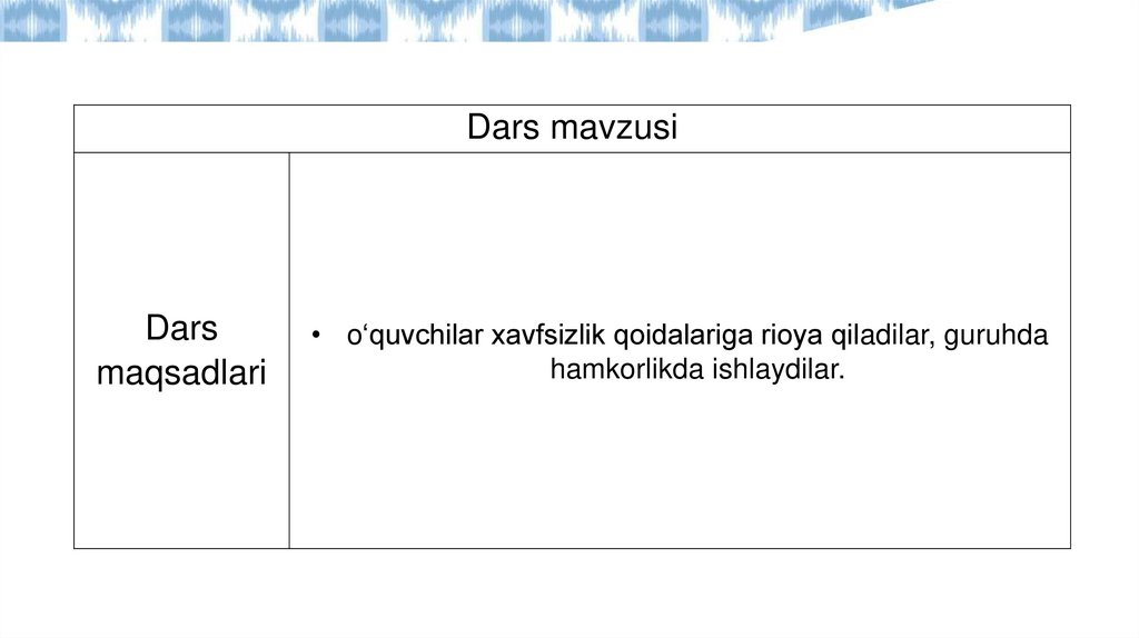 • o‘quvchilar xavfsizlik qoidalariga rioya qiladilar, guruhda